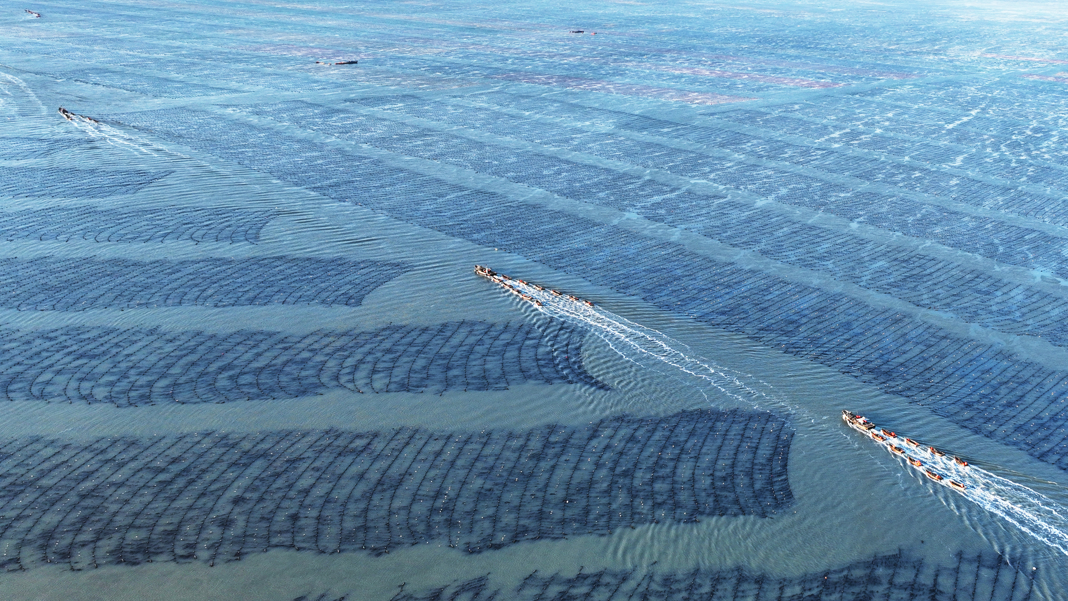 3月2日,在山东省荣成市爱伦湾海洋牧场,养殖工人驾驶着养殖船穿梭于海带养殖区(无人机照片)。新华社发(王福东 摄)