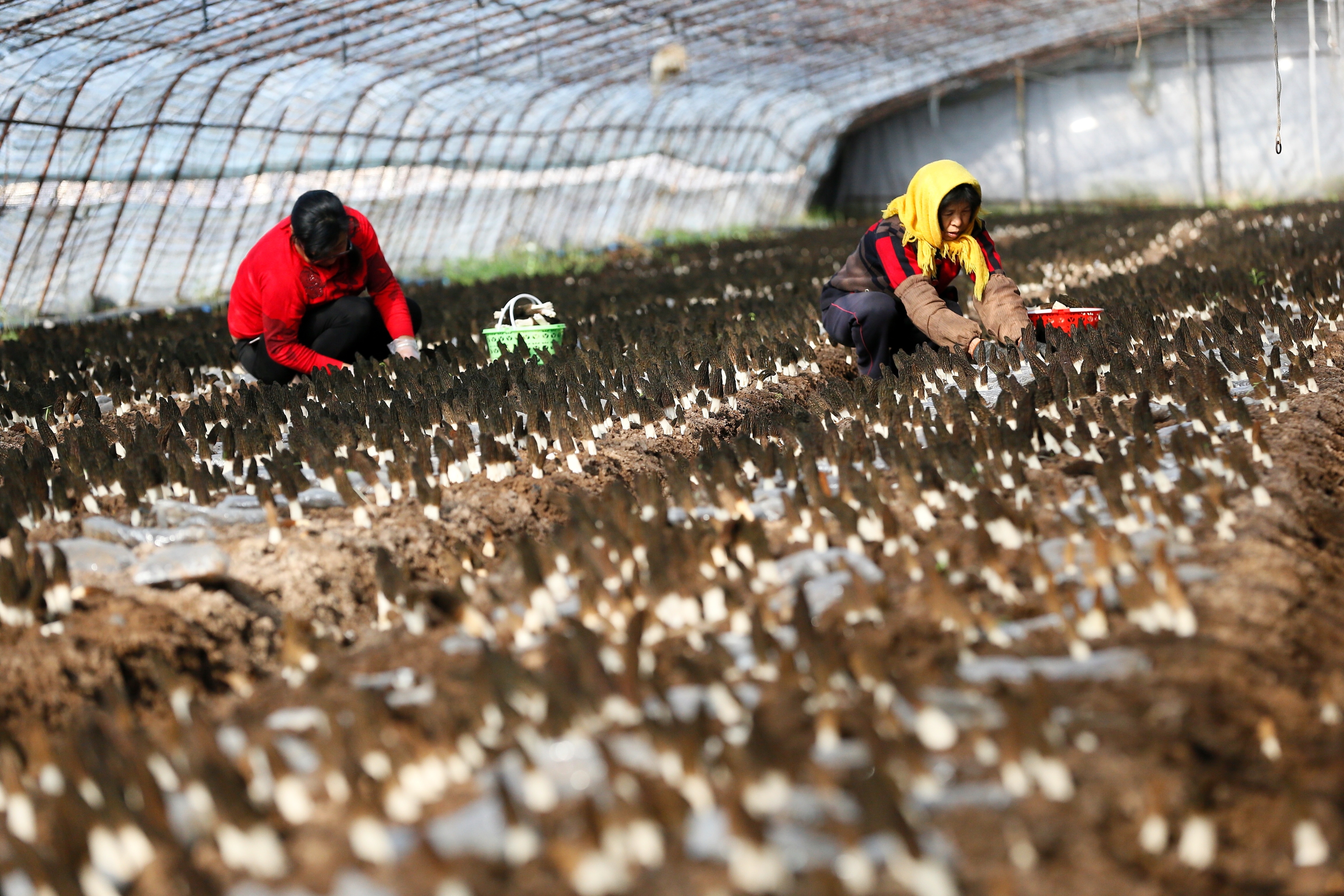 3月31日,在即墨区灵山街道的青岛大地欢歌果蔬专业合作社,农民在大棚里采收羊肚菌。新华社发(梁孝鹏 摄)