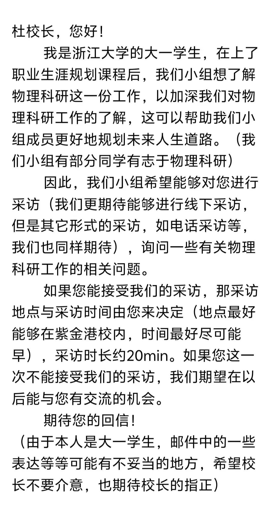 近日,在职业生涯规划课的后,浙江大学2023级的4位本科同学抱着尝试的心态,向校长杜江峰发了一封邮件,咨询物理领域科研工作的相关情况。