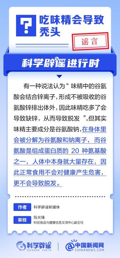 中新网6月4日电 有说法认为“味精中的谷氨酸会结合锌离子,形成不被吸收的谷氨酸锌排出体外,因此味精吃多了会导致缺锌,从而导致脱发”。但其实味精主要成分是谷氨酸钠,在身体里会被分解为谷氨酸和钠离子,而谷氨酸是组成蛋白质的20种氨基酸之一,人体中本身就大量存在,因此正常食用味精不会对健康产生危害,更不会导致脱发。(来源:@科学辟谣 中国新闻网微博)