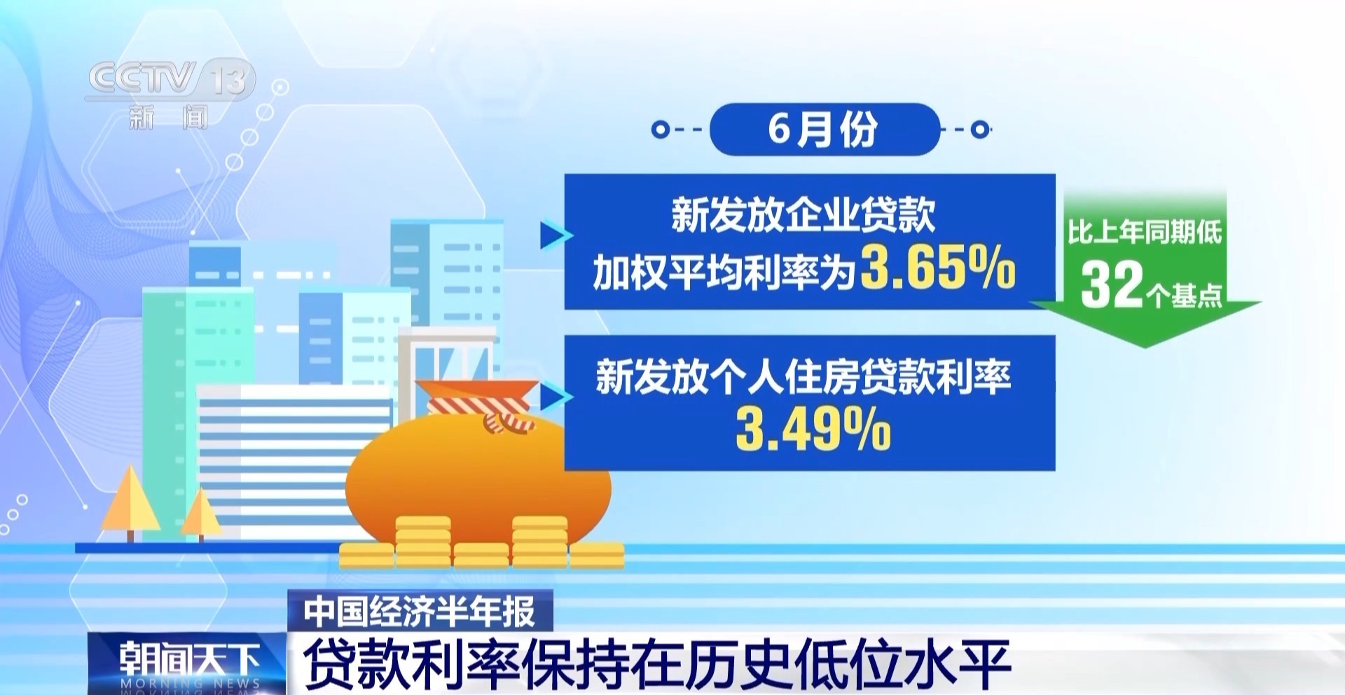 数据显示,6月份新发放企业贷款加权平均利率为3.65%,比上年同期低32个基点;新发放个人住房贷款利率为3.49%,比上年同期低65个基点,均处于历史低位。