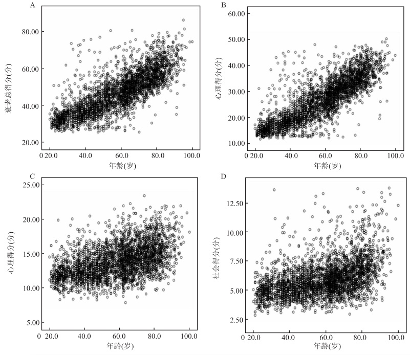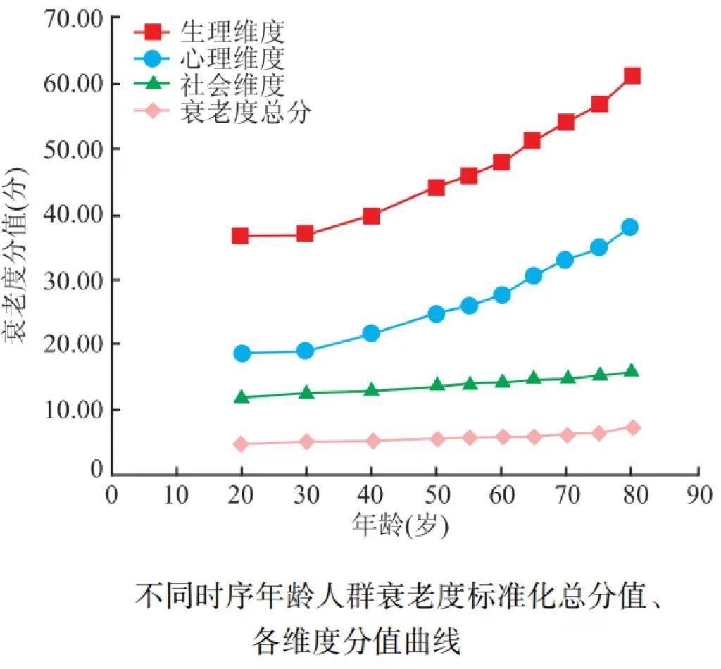 但实际上,衰老不是一个突然的事情,而是一个很早就发生的事情,比如有人从生理、心理和社会等多个维度对衰老进行了一个度量检测,我们可以发现,这些因素都是和年龄呈现了一定程度的正相关。