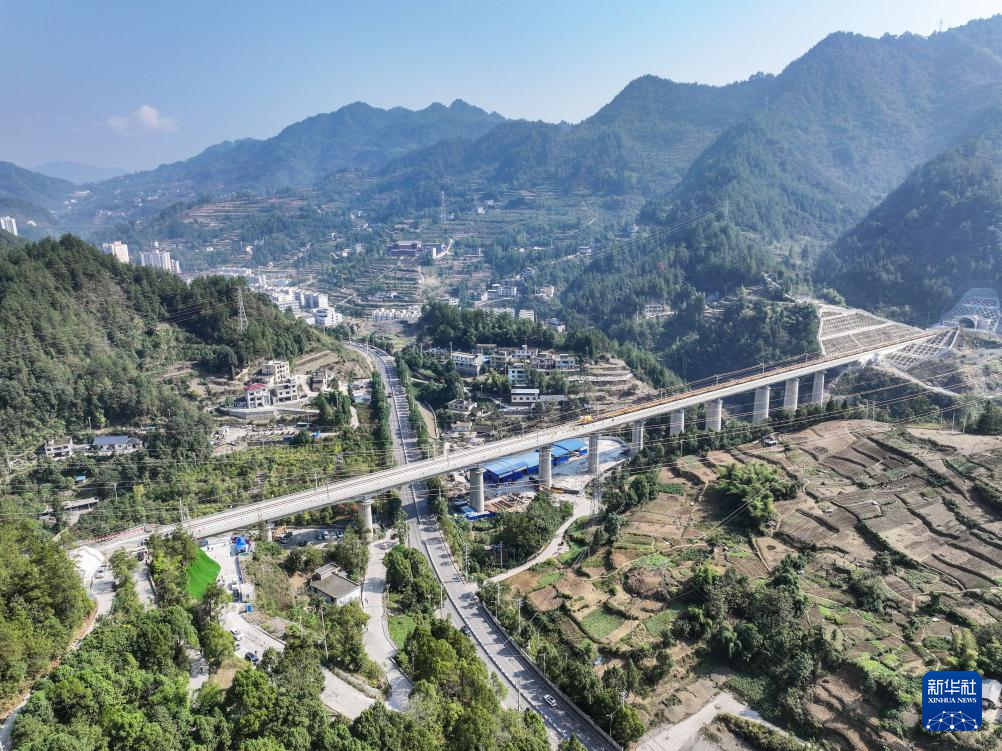 这是10月9日拍摄的渝厦高铁重庆东至黔江段铺轨施工现场(无人机照片)。新华社记者 唐奕 摄