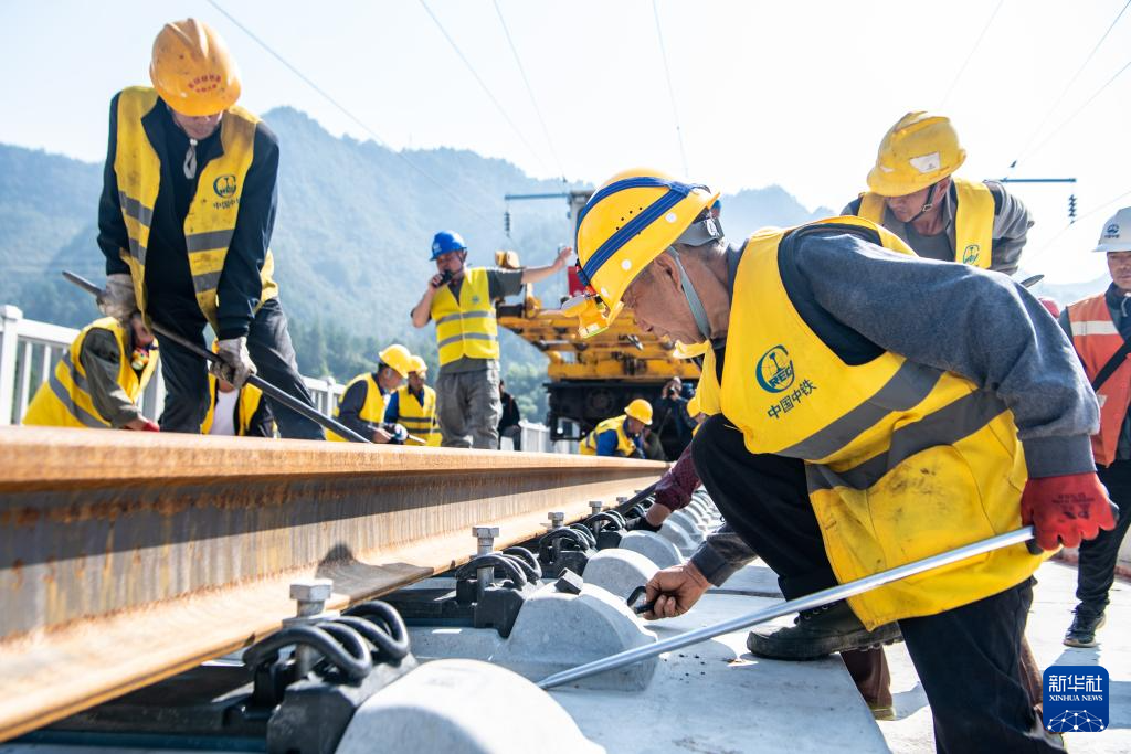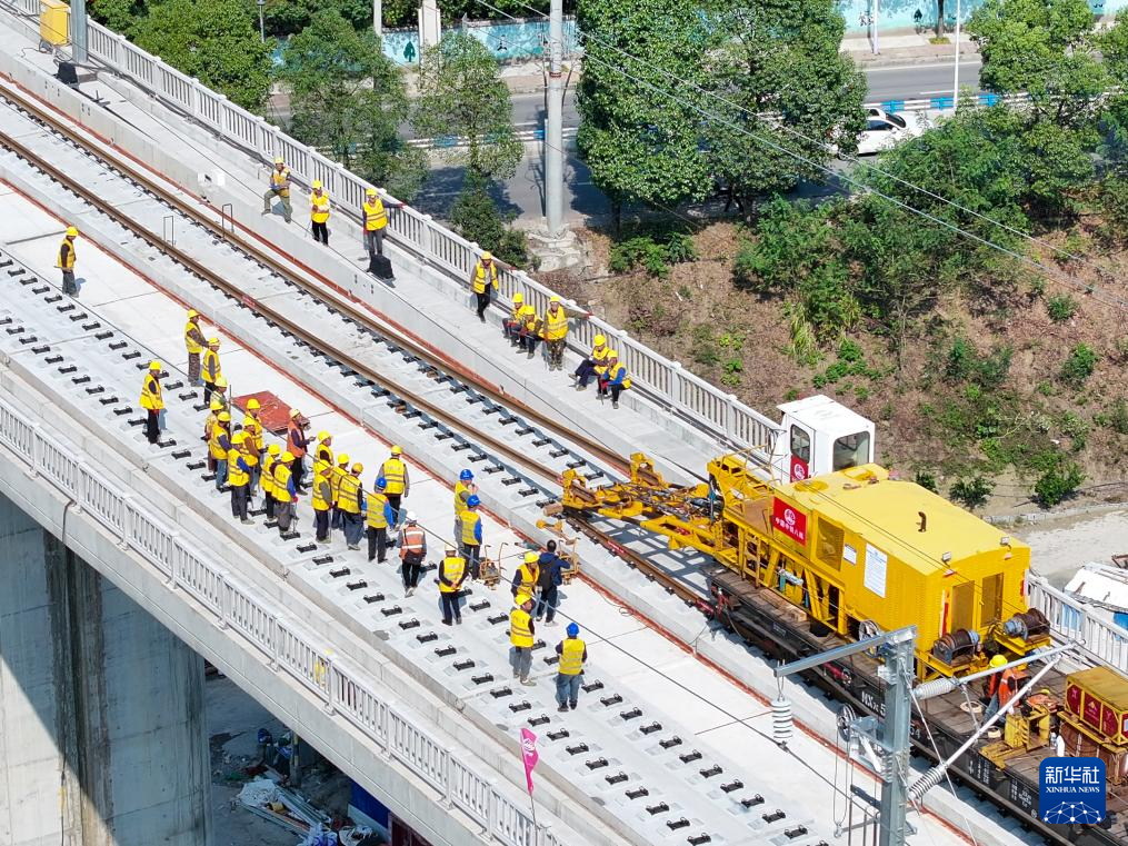 10月9日,工人在渝厦高铁重庆东至黔江段施工现场进行铺轨作业。新华社记者 唐奕 摄