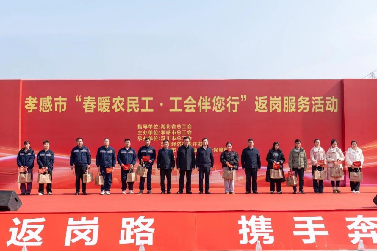 2月15日,湖北省“春暖农民工·工会伴您行”孝感专场就业招聘活动在汉川经济开发区拉开帷幕,通过线上线下联动、政策保障与岗位对接相结合,为农民工、返乡人员等重点群体提供全方位就业支持,助力工业生产实现“开门红”。湖北省总工会党组书记、常务副主席陈惠霞,湖北省总工会副主席胡甲文,孝感市政府副市长,汉川市委书记黄建军出席现场招聘活动。活动现场为30名返岗农民工发放了交通补助金和爱心礼包。