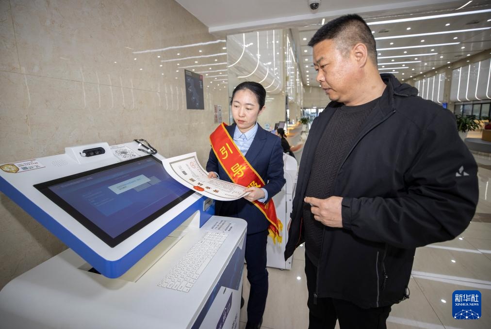 3月21日,在银川市审批服务管理局企业服务大厅,工作人员引导办事人员打印营业执照。新华社记者 杨植森 摄