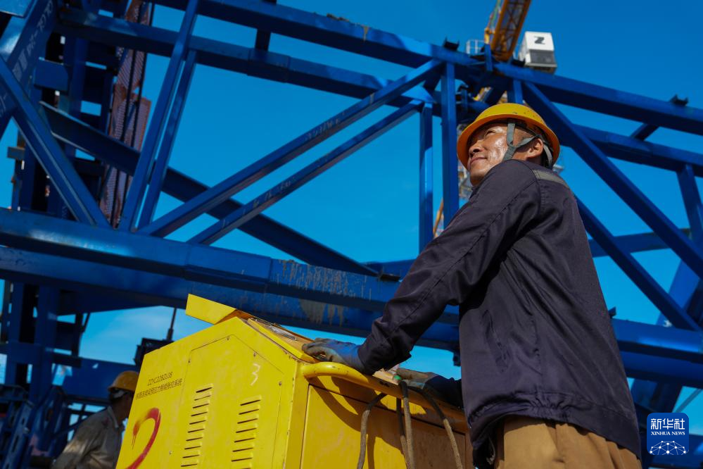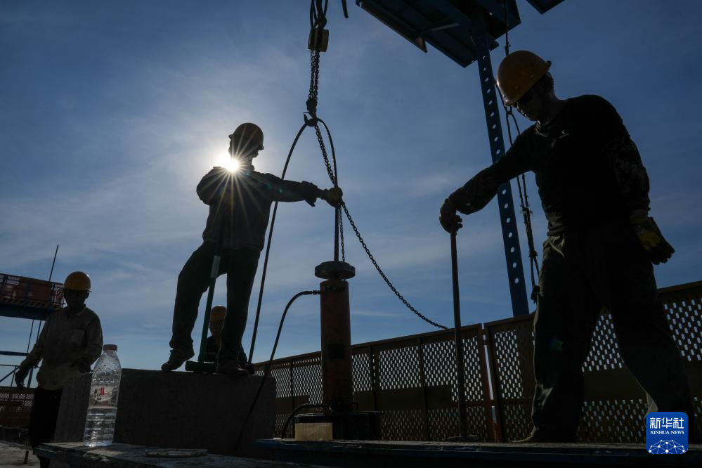 7月3日,中铁上海工程局的工人在宁淮城际铁路(南京至淮安)5标项目跨203县道连续梁施工现场作业。新华社记者 李博 摄