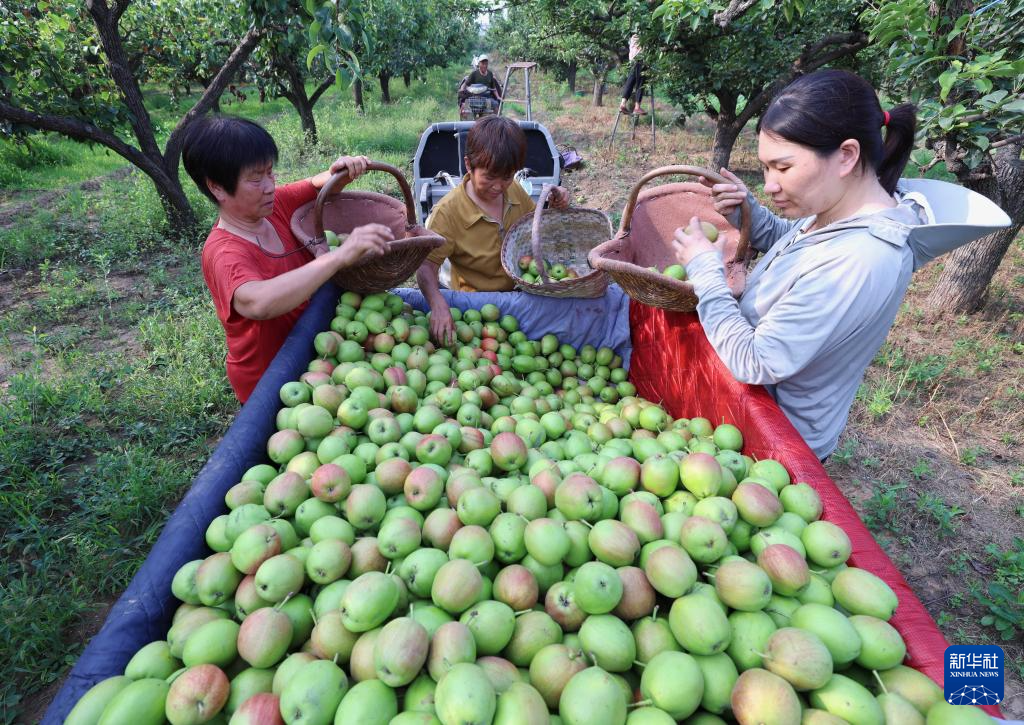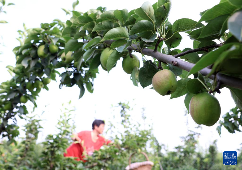 7月8日,河北省赵县范庄镇秀才营村果农在梨园采摘鲜梨。新华社记者 杨世尧 摄