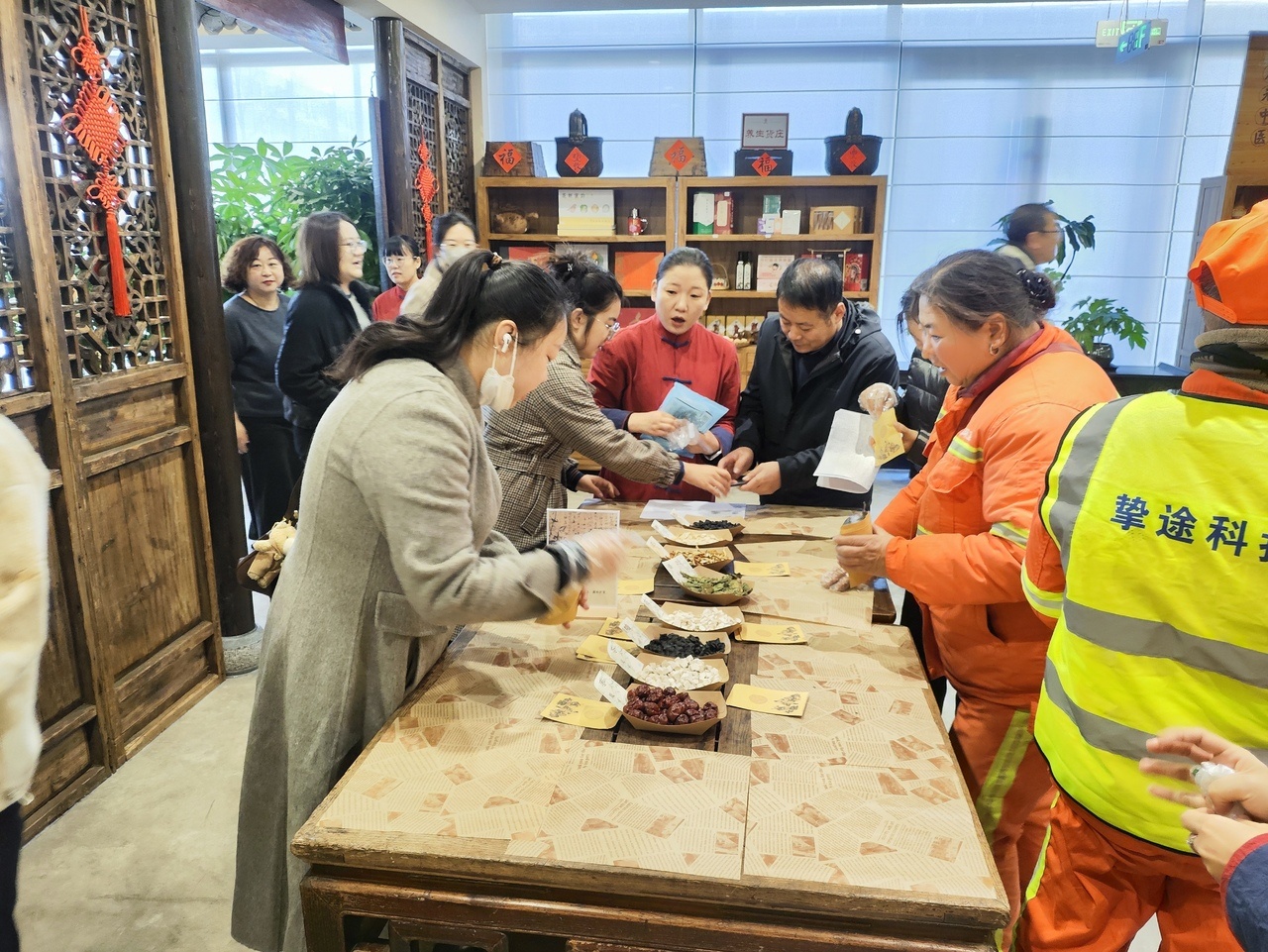 职工迷你疗休养活动面向街道工会所属一线职工,重点覆盖优秀生产工作者、技术工人、新就业形态劳动者、环卫工人、当年退休职工等群体,不定期开展,每批次参与人数为30至50人。活动以中医文化为核心,设计了一系列丰富多彩的内容:从参观中医文化廊、中药房,到品鉴养生茶饮与药膳;从一对一健康问诊、中医理疗体验,到亲手制作国风香囊与养生茶包,再到由专业医师带领练习“八段锦”等传统养生功法。在专业引导下,职工们能够全方位感受中医文化的博大精深,掌握实用养生技能,实现身心双重放松。