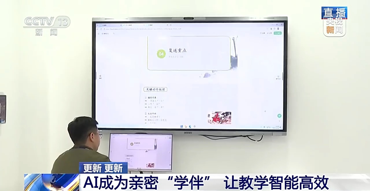 总台记者 王利:目前我国人工智能技术迭代持续加速,从实验室到生产线,从供给侧到消费端,一场深刻变革正在悄然发生。我们先来看一下,教学大模型是如何帮助老师们进行备课的。我们可以把传统的备课过程想象成老师自己“手写教案”,老师需要查阅大量资料、设计教学活动、制作课件,通常要花费好几个小时。而“AI+备课”,就像是给老师配备了一位“智能教学助手”。这位“助手”能根据老师设定的教学目标和知识点,自动生成教学大纲、课件甚至还包含课堂互动环节。当工作人员输入本节课的主题后,系统很快就生成了一份完整的教学方案。