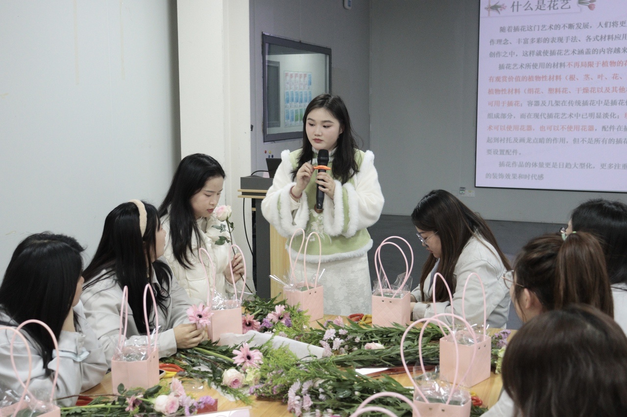 活动邀请江西省技术能手、抚州市插花花艺协会会长易家璇现场授课。活动现场,玫瑰、康乃馨等各色花材错落有致地摆放在长桌上,芬芳扑鼻。易家璇从什么是花艺、花材识别、花材的应用、色彩搭配、造型设计、花语寓意、鲜花养护知识等方面进行了深入浅出的讲解,并现场演示了插花的步骤和技巧。