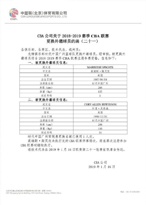 央视网消息:北京时间1月16日,CBA公司宣布,广州男篮用科里-杰弗森顶替被停赛4场的斯贝茨出战常规赛。
