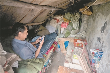 9月3日,李加法途径一个“趴趴屋”时在里面歇一会儿。这里曾是他们的宿舍,墙是用石头和废弃的建筑材料垒砌而成,房顶是用木头和防雨布简单搭建的。有了新的宿舍后,这些特意保留下来的“趴趴屋”成了挑山工们的临时歇脚点。