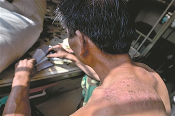 9月3日中午,王怀玉在宿舍统计自己的发货单,这是他到月末领取工钱的凭证。王怀玉做挑山工已经15年了,背上磨出了厚厚的老茧。