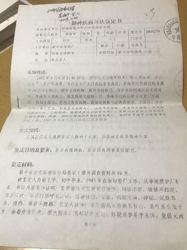 11月19日,司法部司法鉴定中心又出具了关于李海军精神状态和刑事责任能力的鉴定书,鉴定李海军患有精神分裂症,案发时及目前均为发病期。