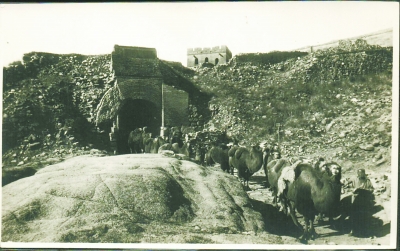 1903年英国摄影师拍摄照片印制的明信片。一群驼队出八达岭关城东城门(“居庸外镇”),向居庸关和北京方向行进。