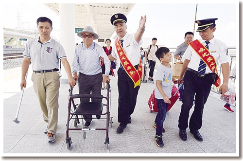 图为“峻屹爱心服务队”正在热情为重点旅客服务。(资料图片)