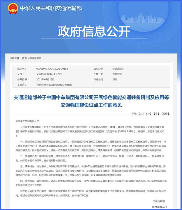 中工网讯 据交通运输部官网消息,近日,交通运输部发布中国中车集团有限公司开展绿色智能交通装备研制及应用等交通强国建设试点工作的意见(以下简称“意见”)。