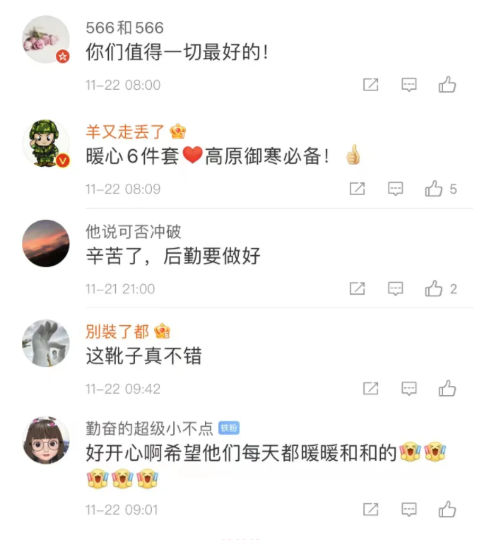 喀喇昆仑的兵哥哥兵姐姐们也收到了暖心过冬“六件套”: