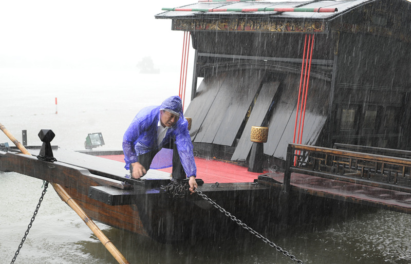 张新志在暴雨天气中拽紧缆索,保护红船免受狂风损害。新华社发 受访者供图(资料图)