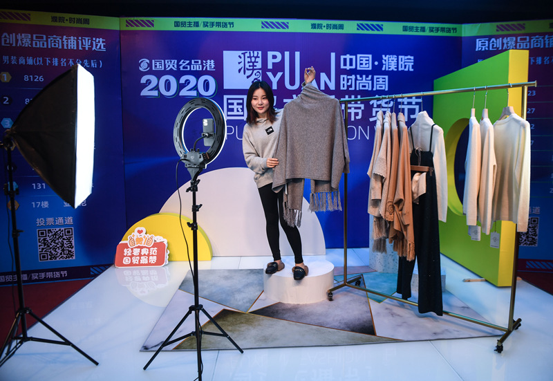 2020年11月17日,一名主播在濮院羊毛衫市场进行直播带货。新华社记者 徐昱 摄