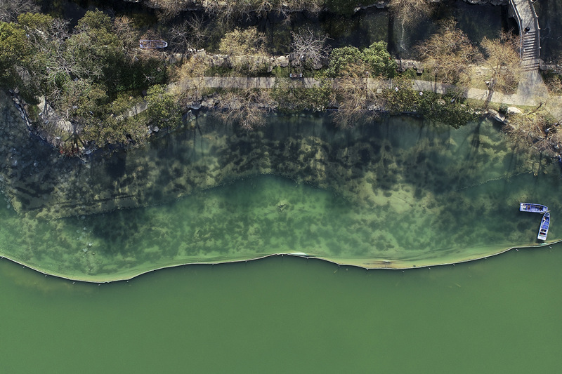 2021年1月19日,在嘉兴市区南湖景区,通过空中、岸边及水下的视角望去,南湖生态环境修复工程(壕股塔试验区、成功堤试验区和七一广场东侧试验区)立竿见影。新华社发 王振宇摄 嘉兴日报供图