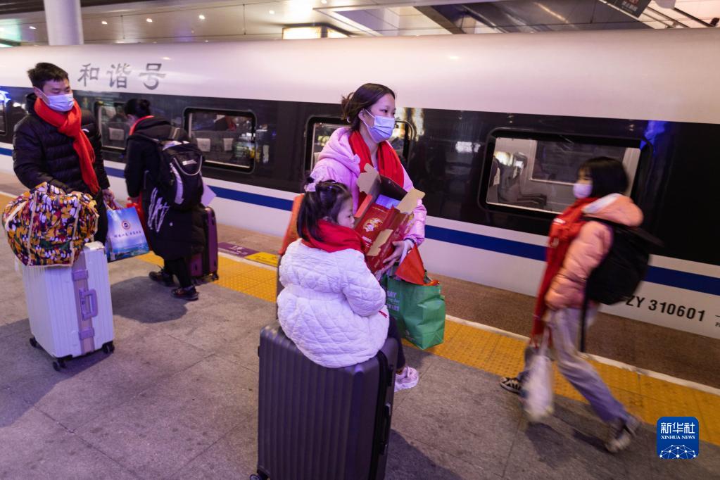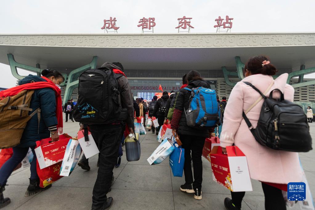 2月1日,务工人员从成都东站乘坐D1753次列车前往广州南站,开启务工之旅。