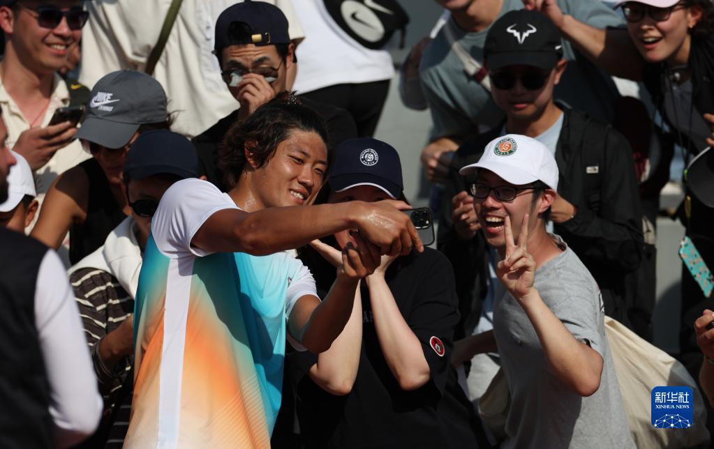 6月1日,张之臻在比赛后与球迷合影。新华社记者高静摄