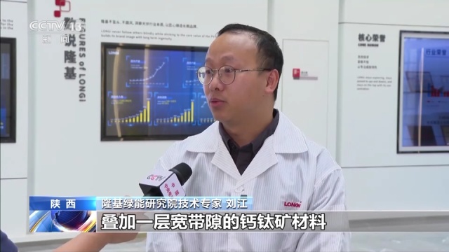 隆基绿能研究院技术专家 刘江:就是在原有的晶硅太阳能电池上面,叠加一层宽带隙的钙钛矿材料,通过这样一个结构可以更加充分、更加有效地利用可见光的光能。通过叠层的技术路线,它的理论极限效率可以进一步达到43%。