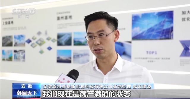 安徽滁州捷泰新能源科技有限公司基地经理 欧阳建波:我们现在是满产满销的状态,每天生产大概620多万片电池片,今年预计上半年的销售额超65亿元,预计今年整年的销售额在120亿元以上。
