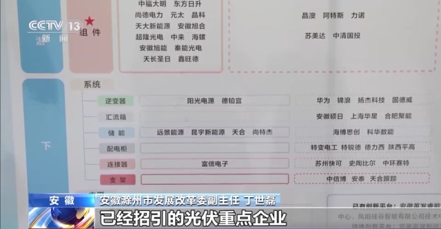安徽滁州市发展改革委副主任 丁世磊:实框里是我们已经招引的光伏重点企业,虚框里是待招引的企业,空白是薄弱环节。加大招引力度,聚力打造产业规模大、龙头企业多、产业生态完善的垂直一体化光伏产业链条。
