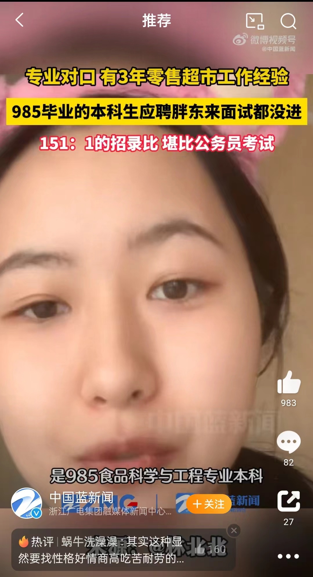 眼下正值春季招聘关键期,一位985院校毕业本科生的应聘视频在近日引发广泛关注。该应聘者称向河南知名企业胖东来投递简历,却未能进入面试环节,在151:1招录比的竞争中败下阵来。