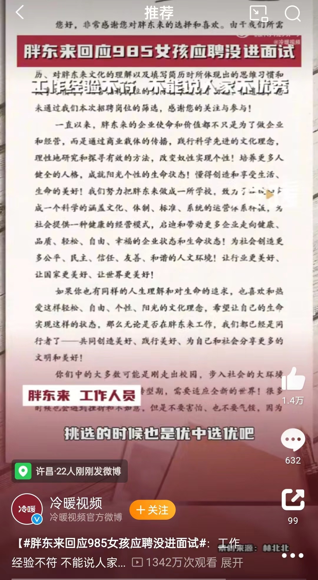 原标题:985毕业进不了胖东来的面试?企业回应道破真相