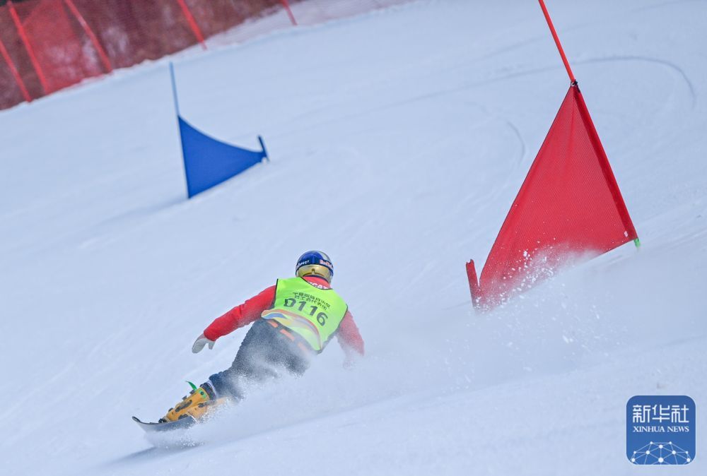 重庆市总工会选手高子尧在单板滑雪男子平行大回转项目比赛中。