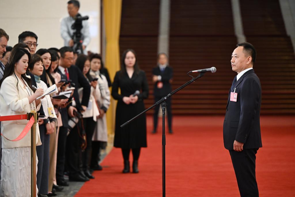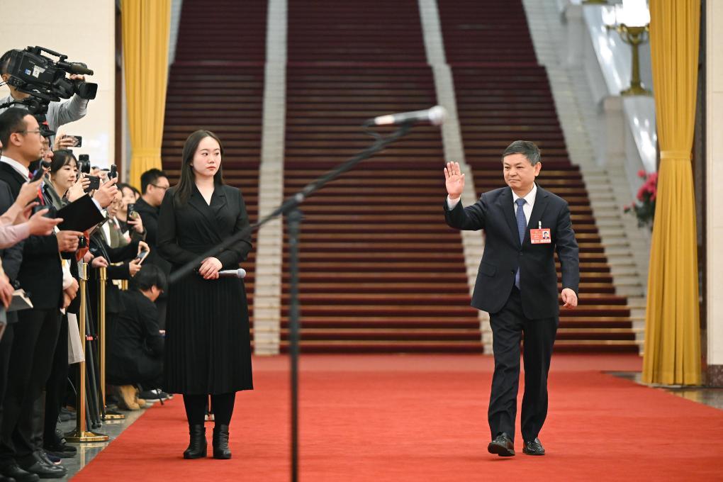 3月8日,第十四届全国人民代表大会第三次会议第二场“部长通道”集中采访活动在北京人民大会堂举行。这是水利部部长李国英接受媒体采访。新华社记者 胥冰洁 摄
