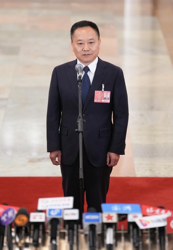 3月8日,第十四届全国人民代表大会第三次会议第二场“部长通道”集中采访活动在北京人民大会堂举行。这是水利部部长李国英接受媒体采访。新华社记者 陈晔华 摄
