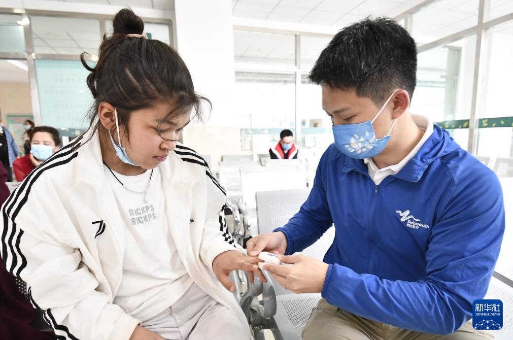 4月8日,参加筛查活动的上海德达心血管医院的志愿者朱佐牧(右)在巴楚县为待筛查儿童测量血氧。新华社记者 李欣 摄