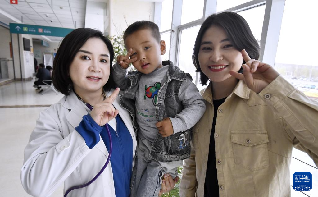 4月8日,一名2023年在上海德达心血管医院进行免费手术治疗的儿童,在家长带领下来到筛查现场进行复查并与为他手术的医生合影。新华社记者 李欣 摄
