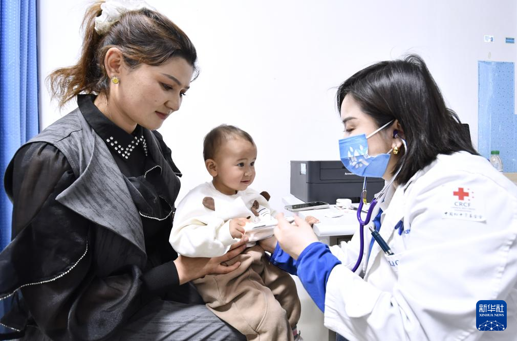 4月8日,上海德达心血管医院儿科医生王丽琴(左)在为巴楚县的儿童进行筛查。新华社记者 李欣 摄