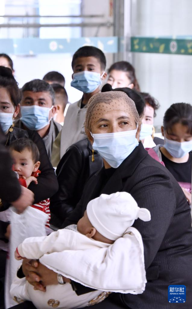 4月8日,巴楚县群众带孩子等待筛查。新华社记者 李欣 摄
