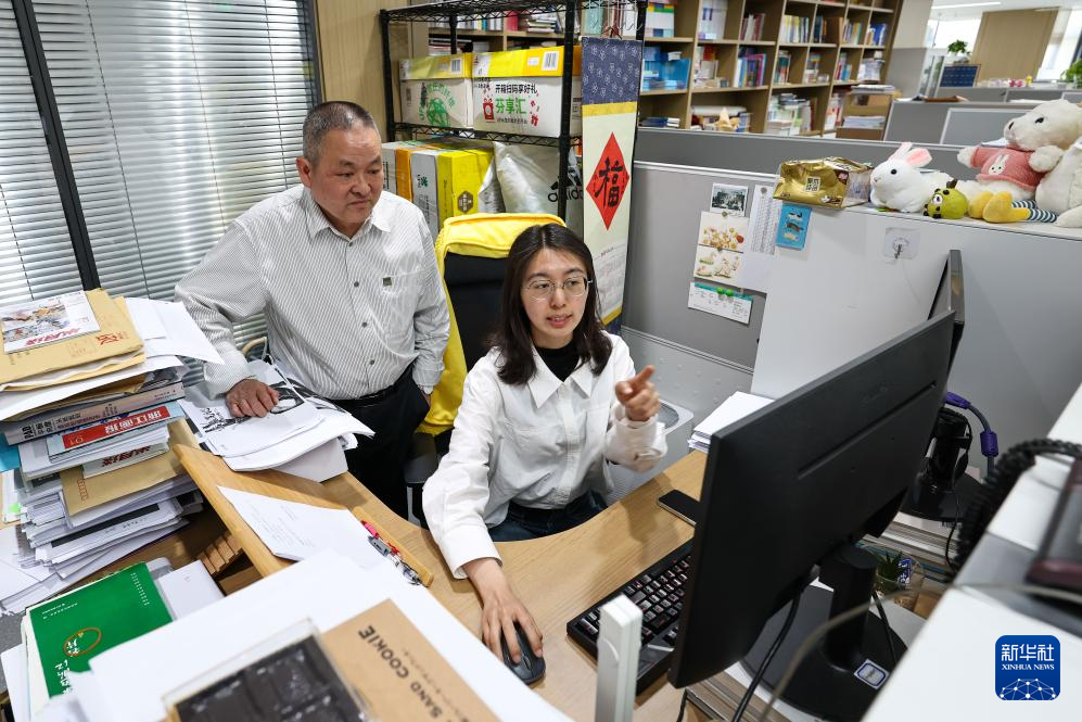 4月15日,作家李英(左)来到位于杭州的浙江摄影出版社,与编辑朱丽莎商讨雷烨作品集的编辑出版事宜。目前,李英与雷烨外甥女项碧英在共同推动出版雷烨的作品集。新华社记者 刘金海 摄