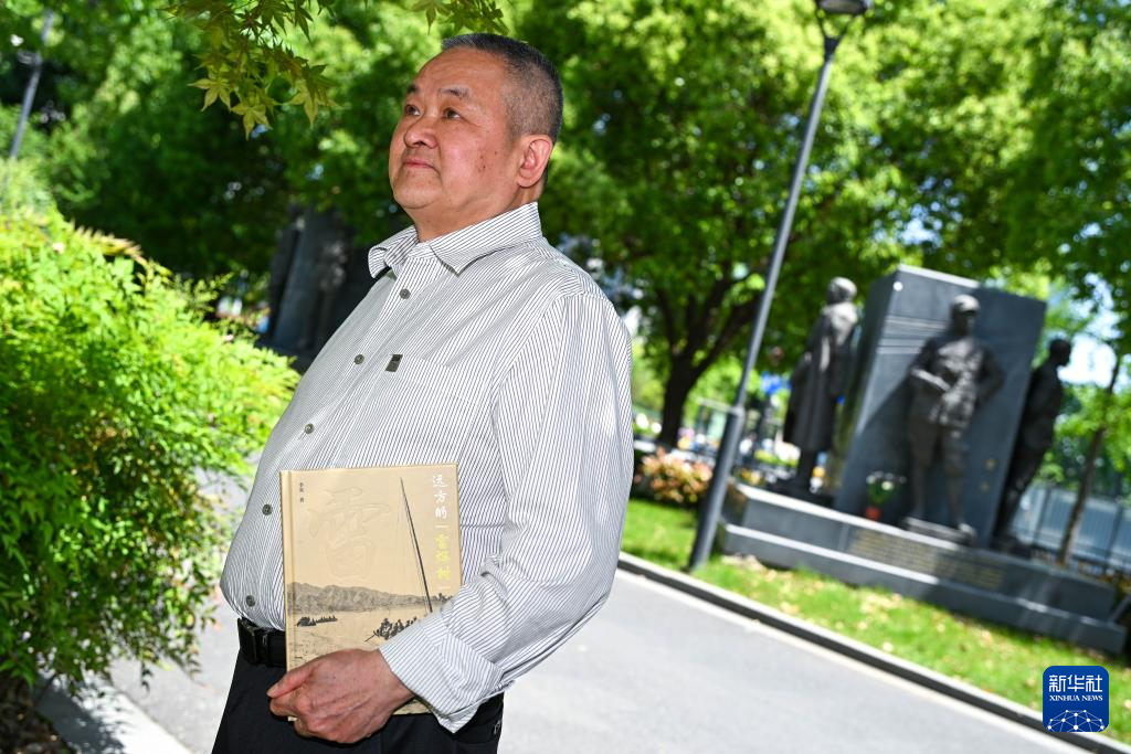 4月15日,在浙江省杭州市,作家李英在浙江展览馆东侧“抗战英烈”雕塑中的雷烨烈士像前,手持自己创作的《远方的“雷烨树”》告慰英烈。新华社记者 刘金海 摄