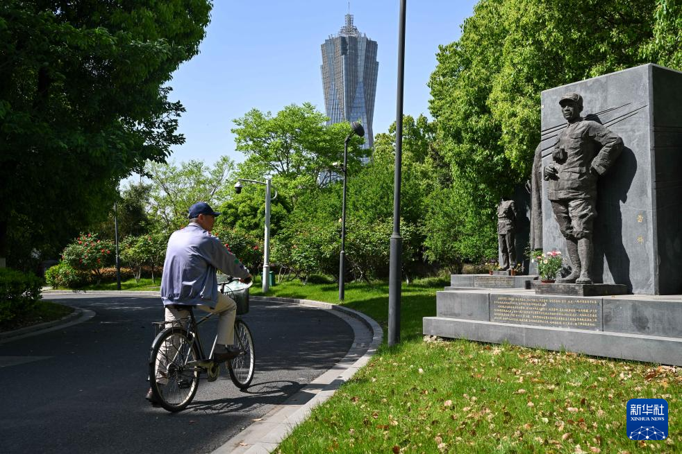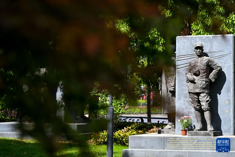 这是4月14日在浙江省杭州市拍摄的“抗战英烈”雕塑中的雷烨烈士像。这组“抗战英烈”铜质雕像于2018年在浙江展览馆东侧落成,以纪念包括雷烨在内的12名浙江籍抗战英烈。新华社记者 刘金海 摄