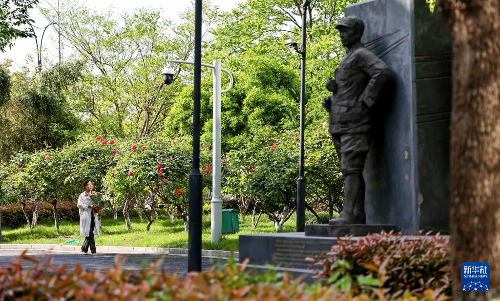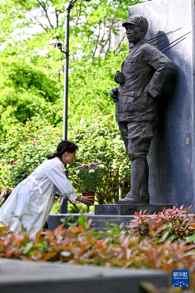4月14日,在浙江省杭州市,雷烨外甥女项碧英前往“抗战英烈”雕塑凭吊雷烨烈士。这组“抗战英烈”铜质雕像于2018年在浙江展览馆东侧落成,以纪念包括雷烨在内的12名浙江籍抗战英烈。新华社记者 刘金海 摄