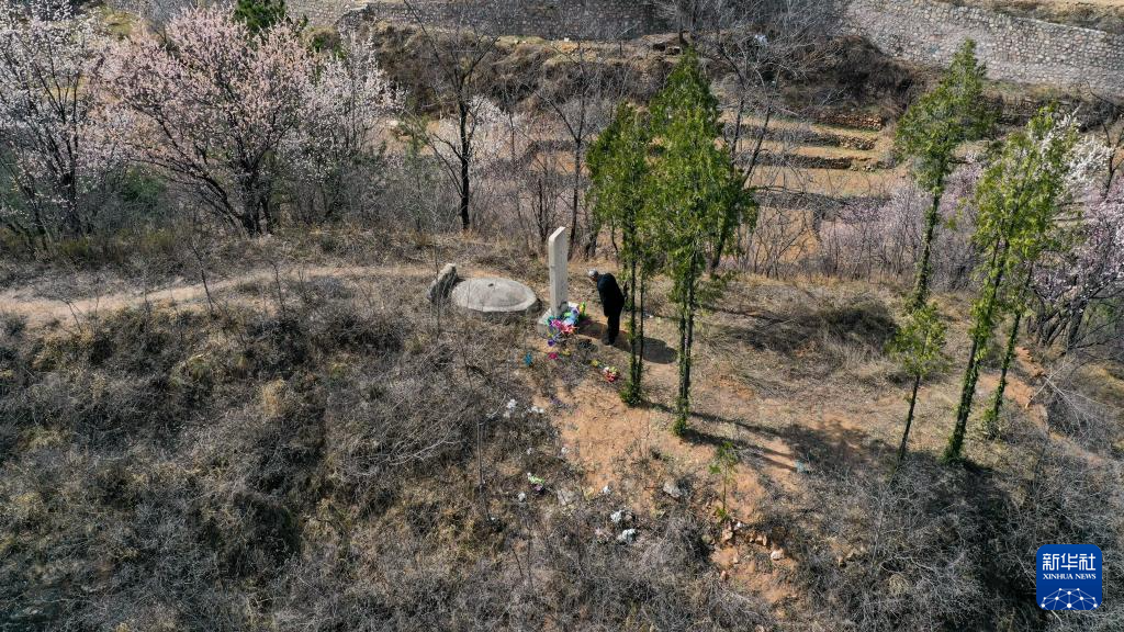 清明节前,河北省平山县南段峪村村民、雷烨希望小学退休教师王海军祭扫“雷烨烈士纪念碑”(无人机照片,3月31日摄)。新华社记者 刘金海 摄