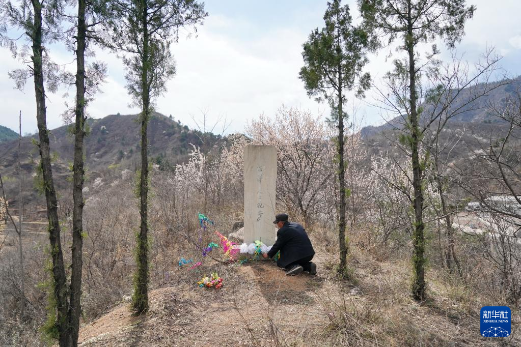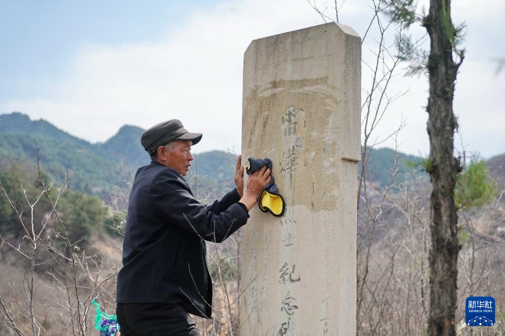 清明节前,河北省平山县南段峪村村民、雷烨希望小学退休教师王海军祭扫“雷烨烈士纪念碑”(3月31日摄)。新华社记者 牟宇 摄