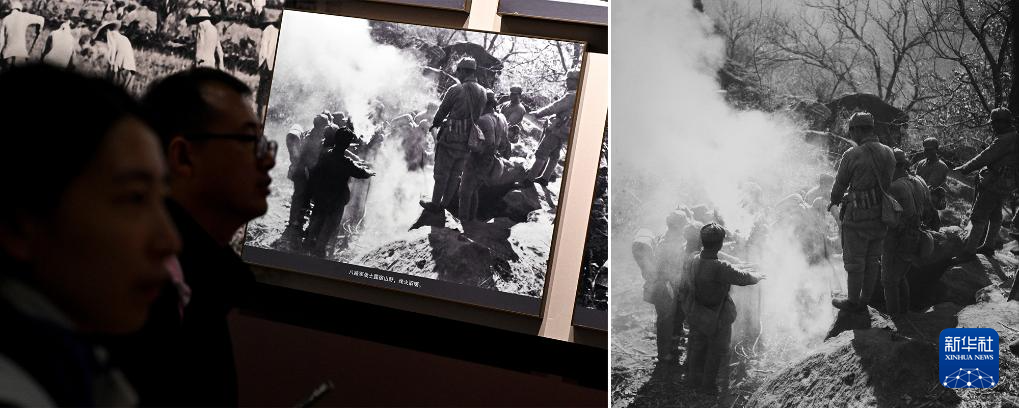 拼版照片:左图为4月6日拍摄的观众参观位于北京的中国人民革命军事博物馆(新华社记者刘金海摄);右图为雷烨摄影作品《熊熊的篝火》(受访者供图)。新华社发