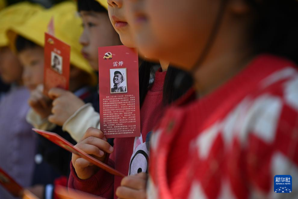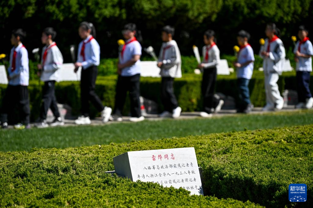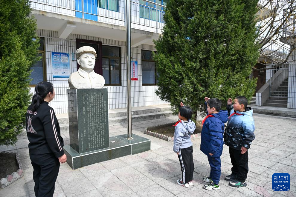 清明节前,河北省平山县雷烨希望小学师生共同缅怀雷烨烈士(3月31日摄)。新华社记者 刘金海 摄
