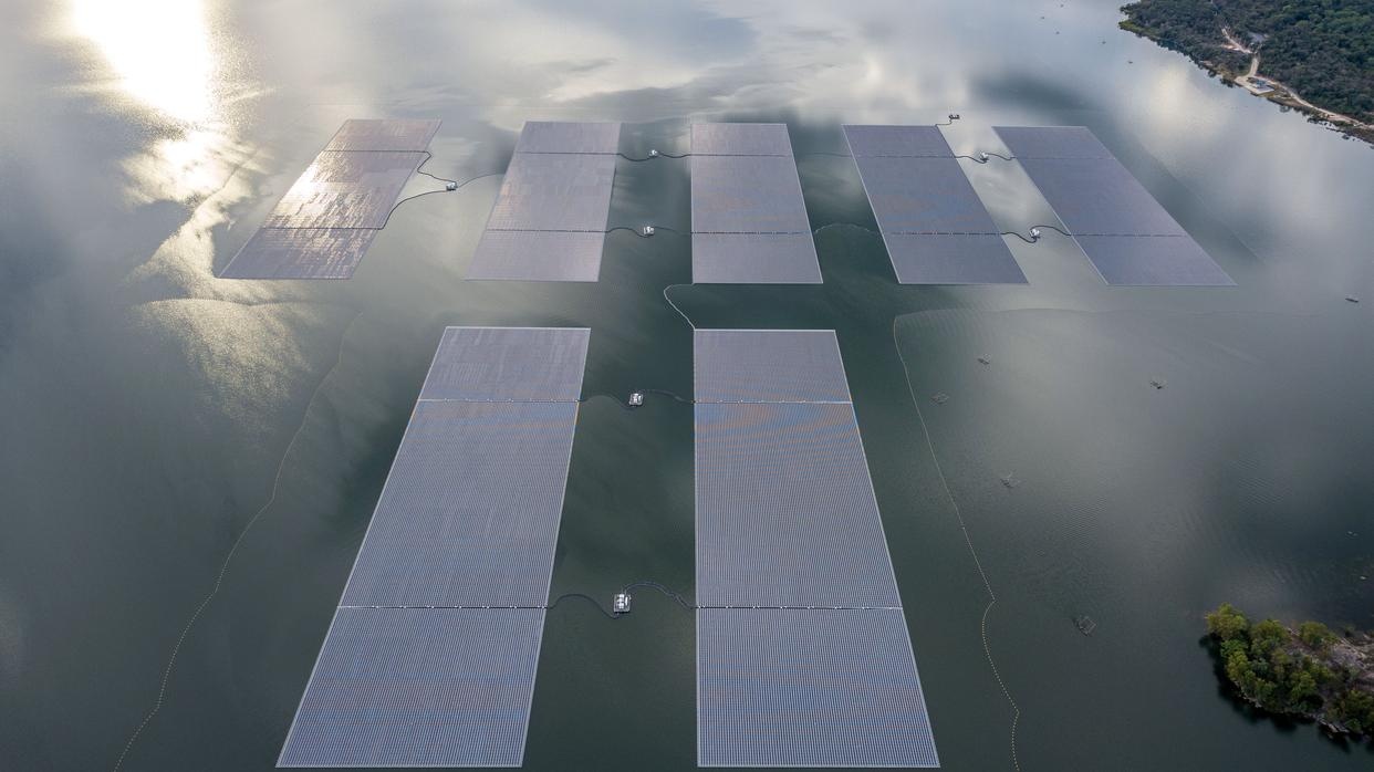这是在泰国乌汶府诗琳通水库拍摄的浮体光伏项目。新华社记者 王腾 摄
