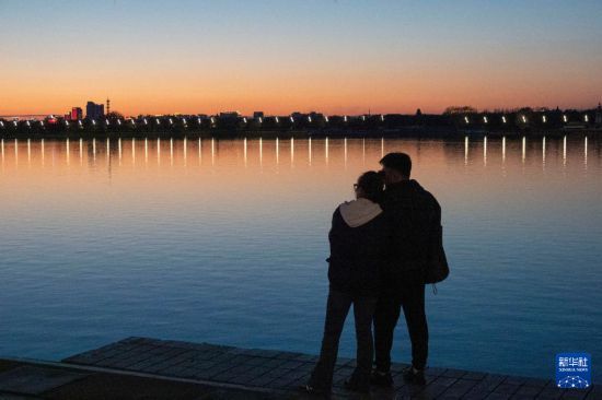 4月22日,一对情侣在松花江哈尔滨段江畔欣赏日落后的江景。新华社记者 谢剑飞 摄
